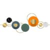 The “Bougatsa” design is a sophisticated composition of interlocking circular discs in a curated palette of bright orange, deep teal, and forest green, accented by luxurious marble textures and shimmering gold centers. Meticulously engineered from a premium blend of Iron, Stainless Steel (SS), and PDF, this piece offers a multi-layered, three-dimensional aesthetic that brings life and movement to contemporary interiors.