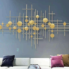The “Baklava” design features a complex, multi-layered grid of horizontal and vertical bars, interspersed with varying sizes of golden circular accents. Crafted from a high-quality blend of iron and stainless steel (SS), this piece offers a sophisticated 3D effect that plays with light and shadow, making it an ideal choice for upscale living rooms, corporate lobbies, or modern lounges.
