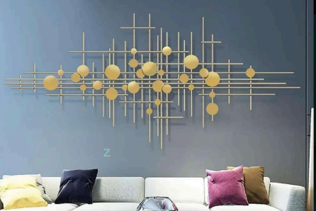 The “Baklava” design features a complex, multi-layered grid of horizontal and vertical bars, interspersed with varying sizes of golden circular accents. Crafted from a high-quality blend of iron and stainless steel (SS), this piece offers a sophisticated 3D effect that plays with light and shadow, making it an ideal choice for upscale living rooms, corporate lobbies, or modern lounges.