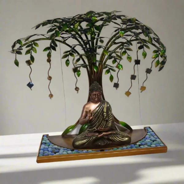 Sprawling Bodhi Canopy: A wide, majestic iron tree arches over the figure, featuring dozens of hand-forged leaves with delicate green-tipped accents.