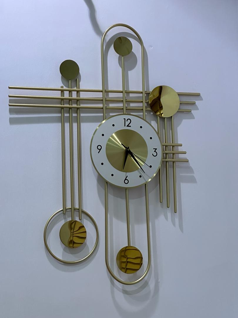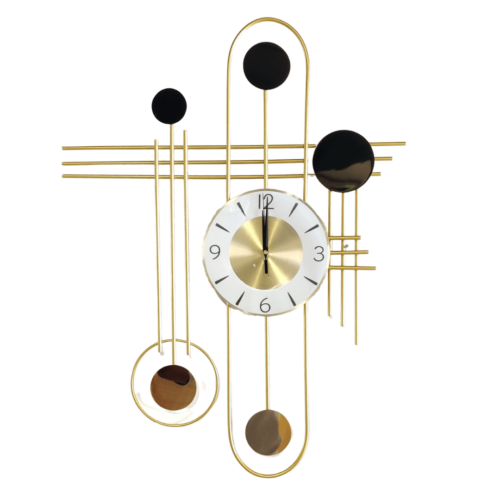 Symmetry & Balance: The design features strategically placed golden discs of varying sizes that provide a sense of orbital movement around the central clock.