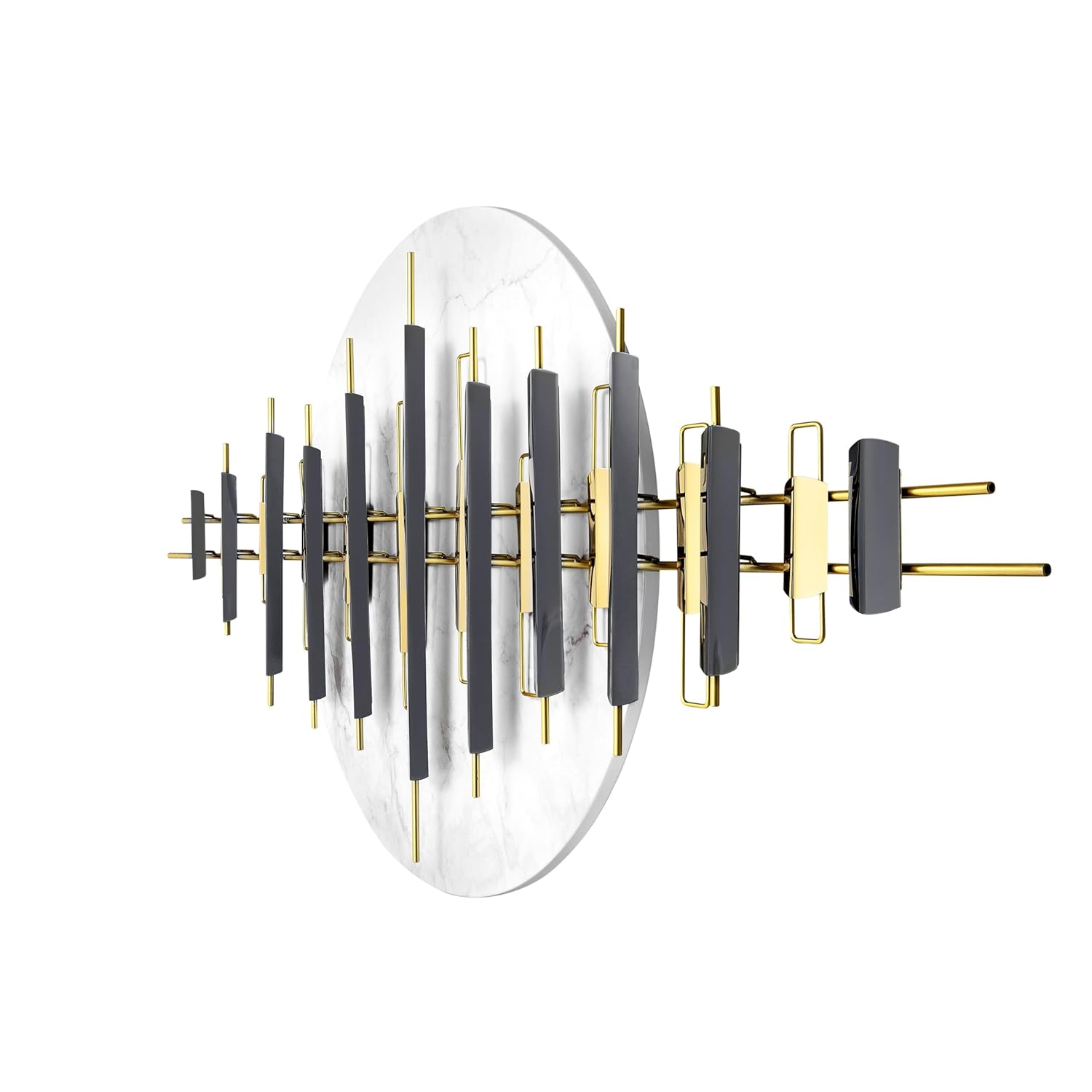 The design features a massive, circular marble-textured backdrop that anchors a rhythmic series of vertical metallic pillars. These bars, finished in a striking mix of polished gold and deep dark tones, create a 3D visual “soundwave” effect that adds depth and movement to your walls. Crafted from a premium blend of Iron and Stainless Steel (SS), this 59-inch wide sculpture is the perfect statement piece for grand living rooms, executive offices, or upscale hotel lobbies.