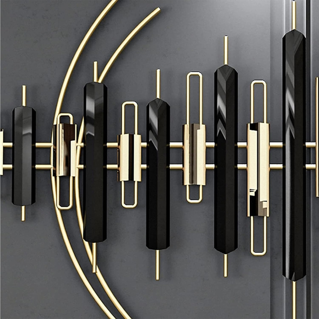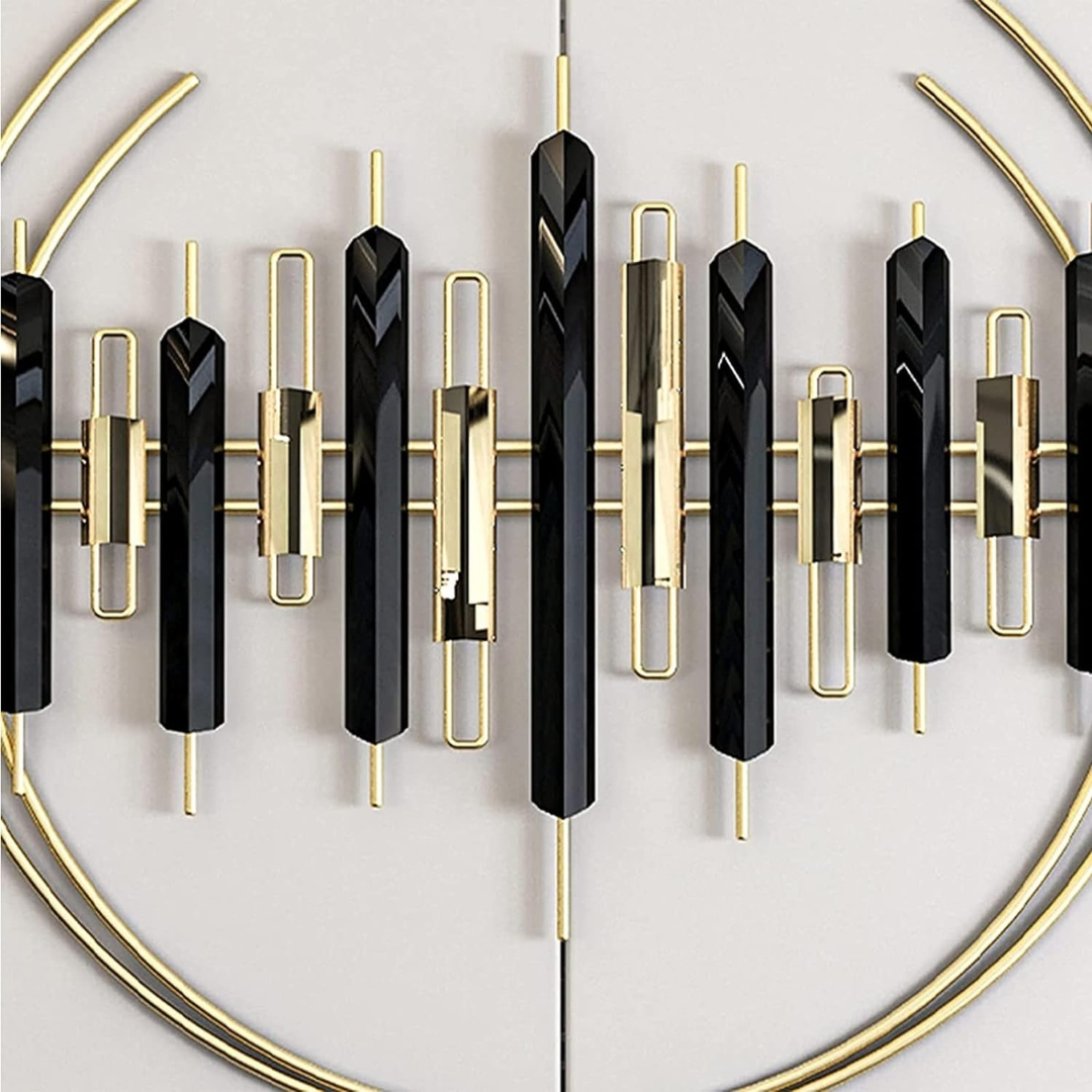 Meticulously crafted from a premium blend of Iron and Stainless Steel (SS), this 59-inch wide sculpture features a massive open ring that serves as a celestial frame for a rhythmic series of vertical bars. The alternating tones of charcoal, polished gold, and metallic accents create a visual “soundwave” effect, making it the ultimate centerpiece for modern living rooms, executive boardrooms, or luxury foyers.
