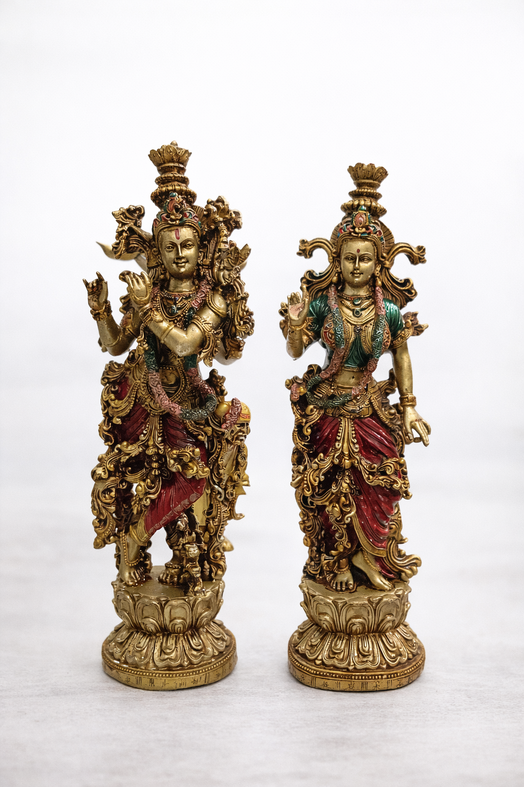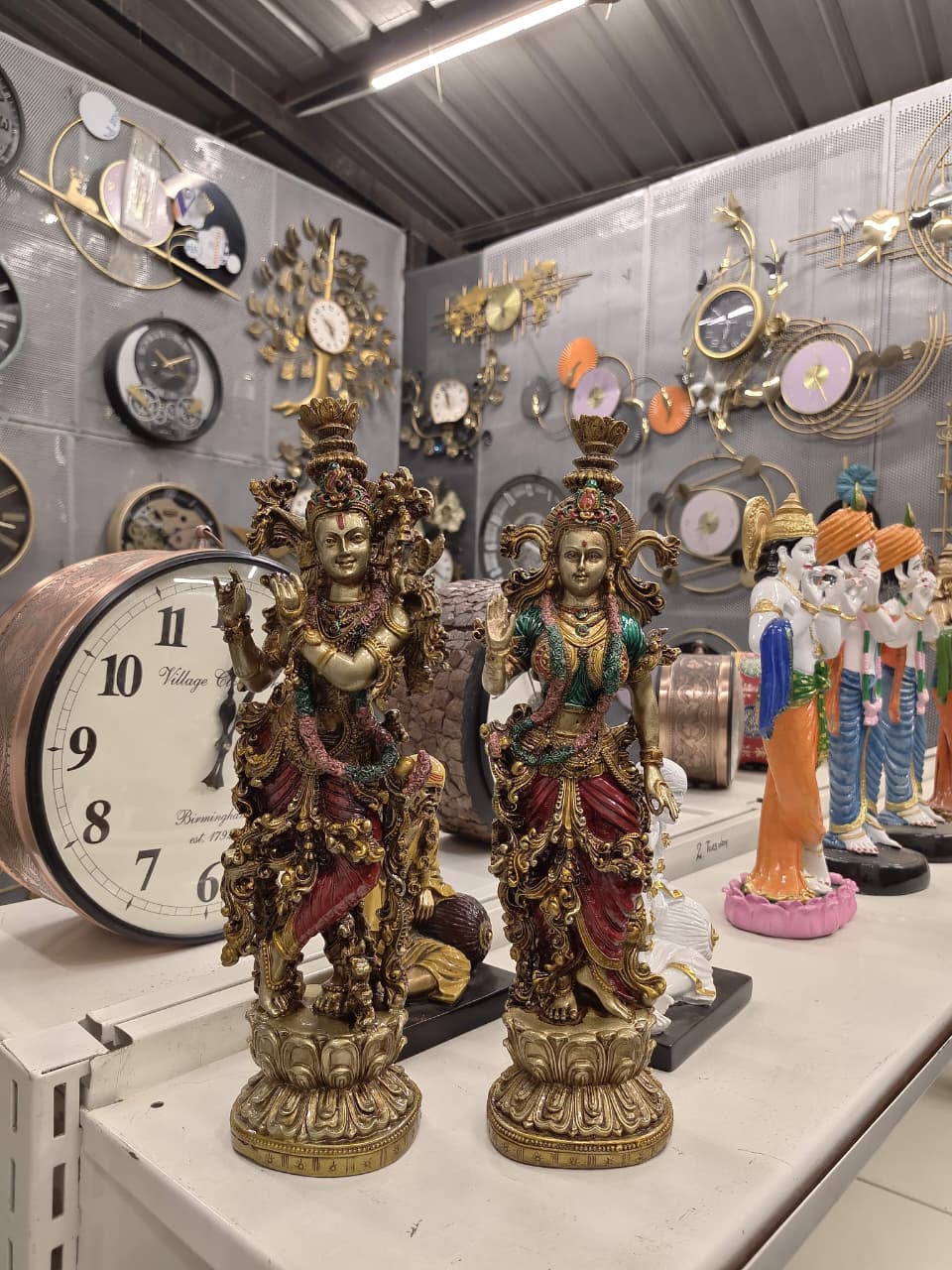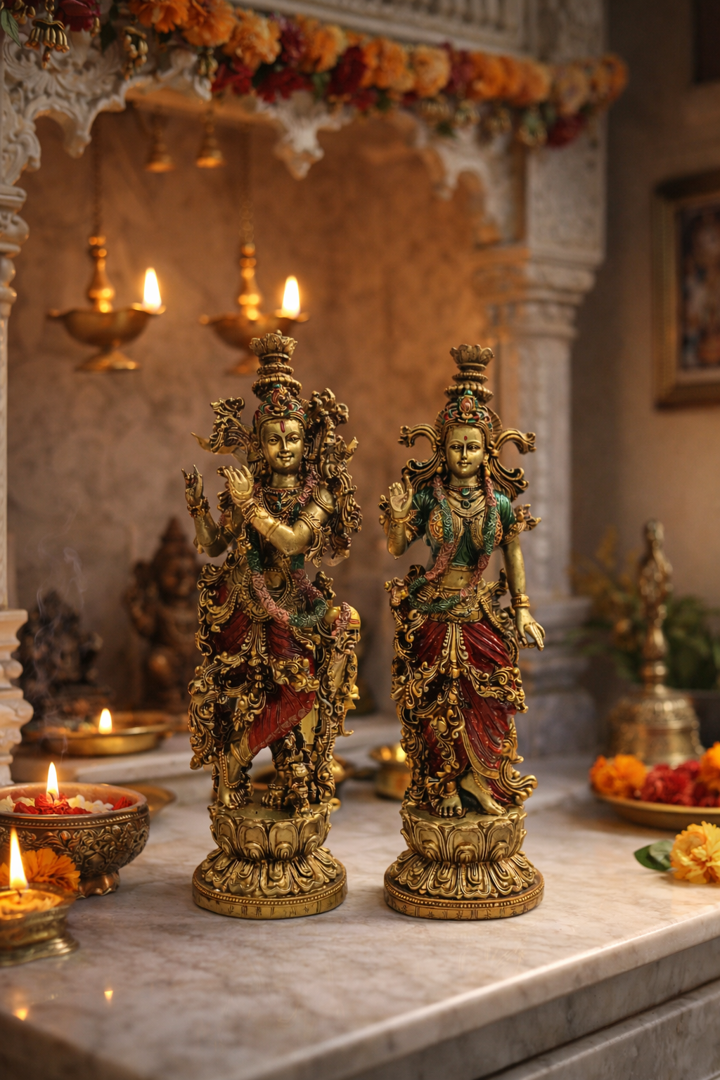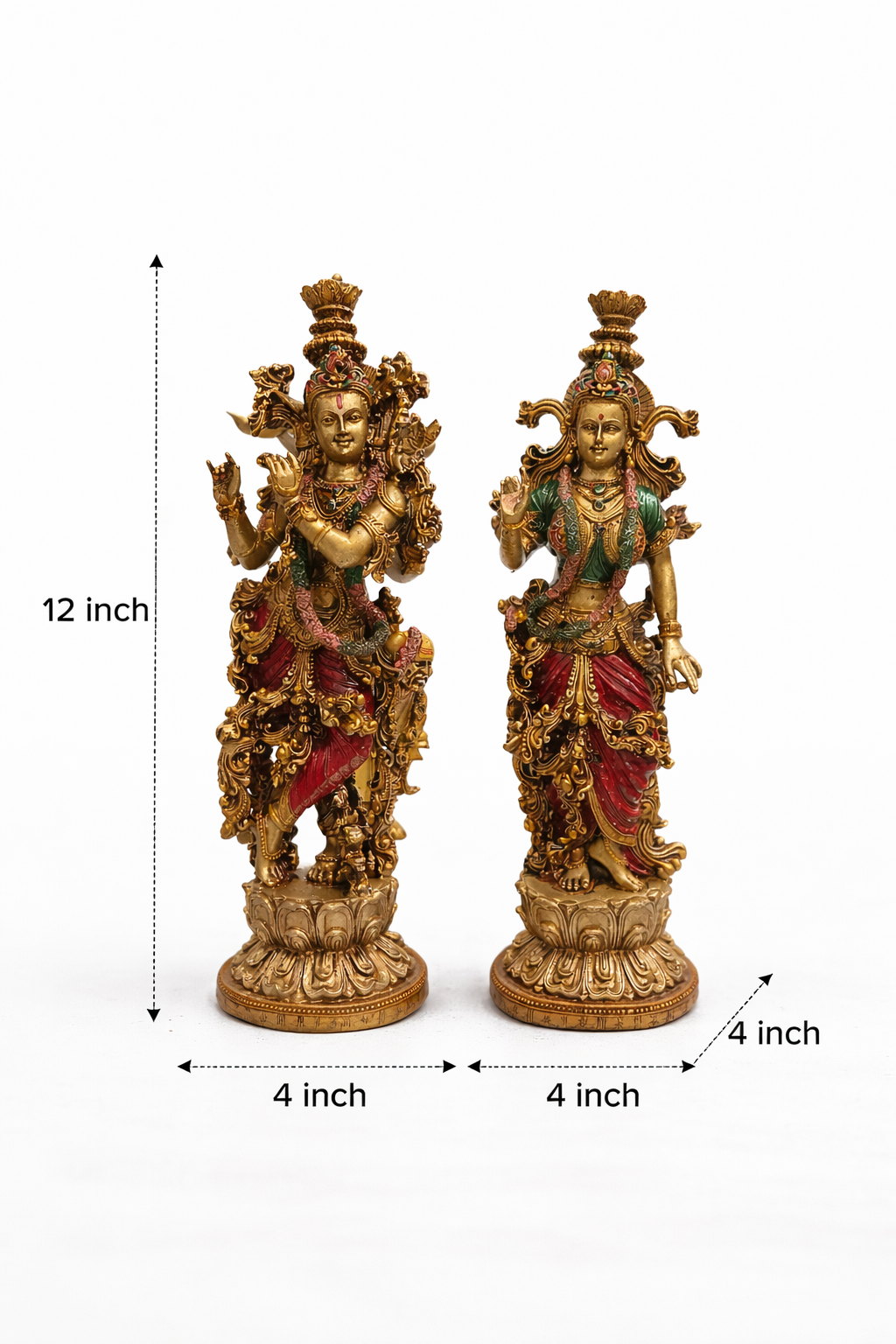 Each idol stands at 12 inches in height and is carefully crafted to highlight intricate ornaments, expressions, and traditional attire. The compact base size makes it easy to place on mandir shelves, consoles, or decorative platforms without occupying excess space.