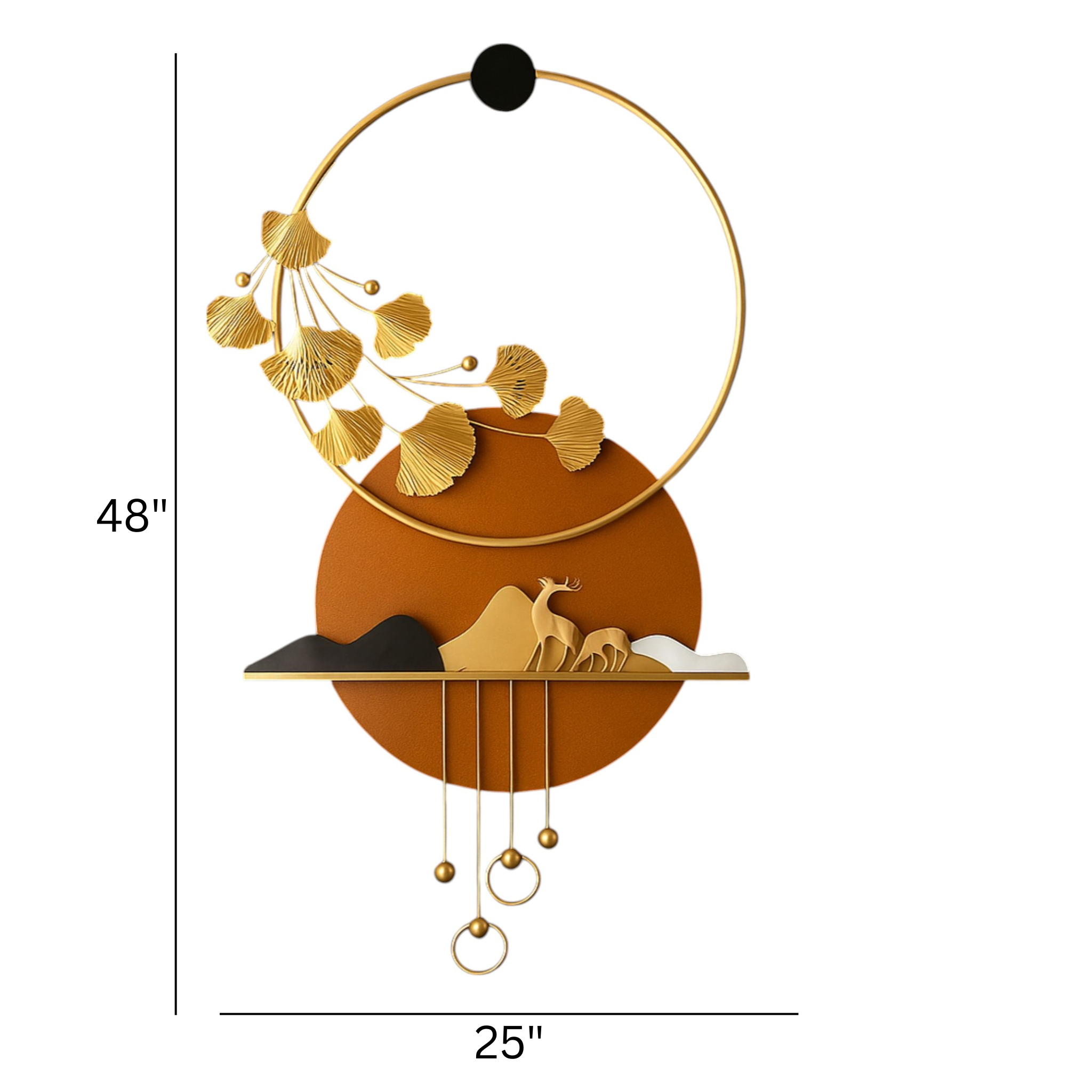 Standing at an impressive 48 inches tall, the Luss Decor features a sophisticated multi-layered design. It showcases intricate golden ginkgo leaves gracefully arching within a large circular frame, set above a mountain landscape where elegant deer silhouettes reside. Finished in a warm autumn palette of burnt orange and shimmering gold, this piece is designed to create a sense of tranquil luxury in any contemporary space.